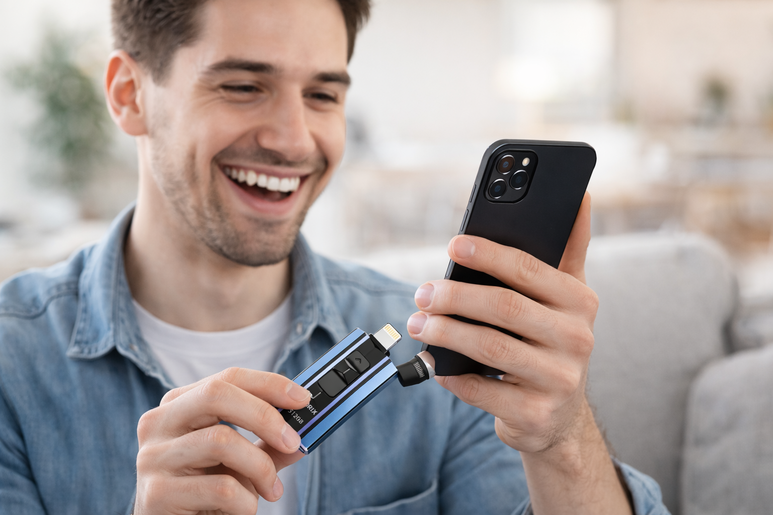 Branchez le PixLibre™ directement sur votre iPhone, Android ou PC. Vos fichiers se transfèrent en quelques secondes sans Wi-Fi, sans compte, sans limite.